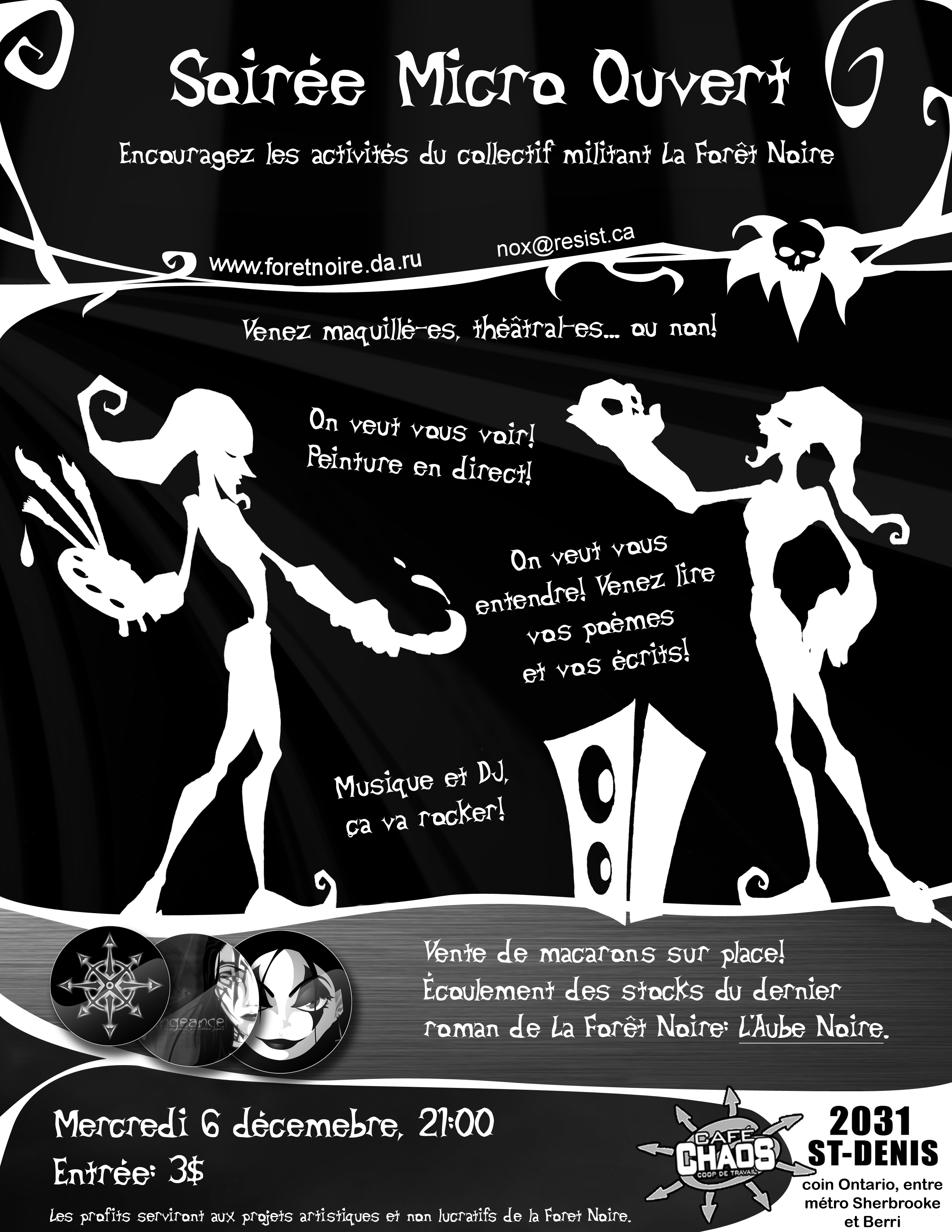 Des nouvelles de la Forêt Noire! Nous sommes inactifs durant l'été, mais serons de retour en septembre avec une nouvelle soirée de création libre! La date exacte est à confirmer... En attendant, voici des photos de la dernière soirée/lancement au Café Chaos. Merci à Cannibal Amical pour les photos! Il y a maintenant une nouvelles section artistes, entièrement refaite, avec galleries de photos, liens et conctacts. Nous hébergeons aussi le site web de notre DJ officiel, Sardaukar, aka Von Bloody Benny. Le vidéo de la pièce de théâtre adaptée de The Noxious and the Daemon Flower est maintenant disponible! Filmé par Jude et édité par Raven, disponible ici. Il s'agit de la seconde représentation de la pièce, durant le Deuxième Festival Anarchiste de Montréal, à la Salla Rosa, le 29 mai. Notre pièce fut présentée devant une salle comble de près de 100 personnes et clotura le Festival. Ce fut un grand succès et nous avons la ferme intention de continuer notre oeuvre!!! Toutes nos publications / macarons sont toujours disponibles à la Librairie l'Insoumise au 2033 bld St-Laurent.